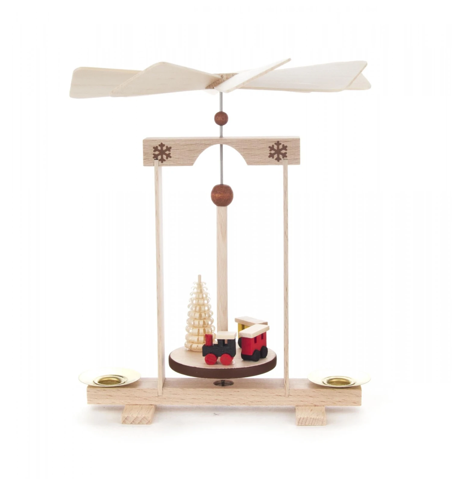Authentic Wooden German Pyramid. This pyramid features one platform with four candle holders. When the candles are lit, the scene on the pyramid will begin to move as the heat from the candles begins to rise. Requires 2 – 10mm Candles – Not Included.