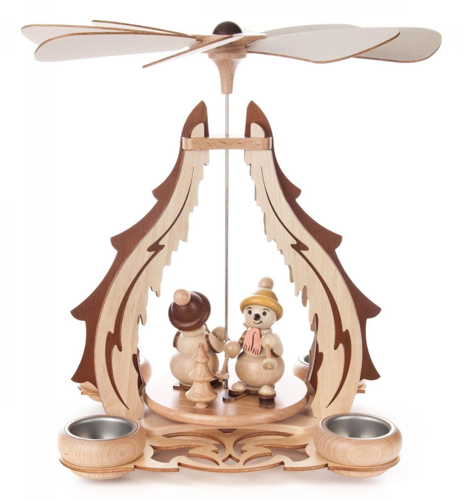Authentic Wooden German Pyramid. This pyramid features one platform with four candle holders. When the candles are lit, the scene on the pyramid will begin to move as the heat from the candles begins to rise. Requires 4 – tealight candles – Not Included.