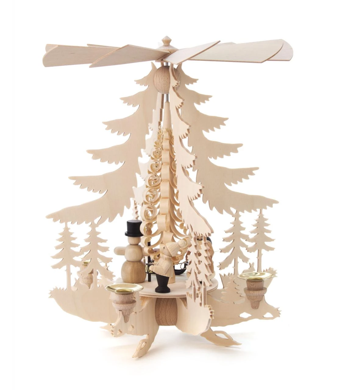 Wooden German Pyramid with Snowman and Carolers. When the candles are lit, the heat will rise causing the blades to spin.