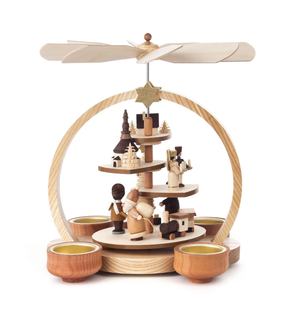 Authentic Wooden German Pyramid. This pyramid features one platform with four candle holders. When the candles are lit, the scene on the pyramid will begin to move as the heat from the candles begins to rise. Requires 4 – tealight candles – Not Included.
