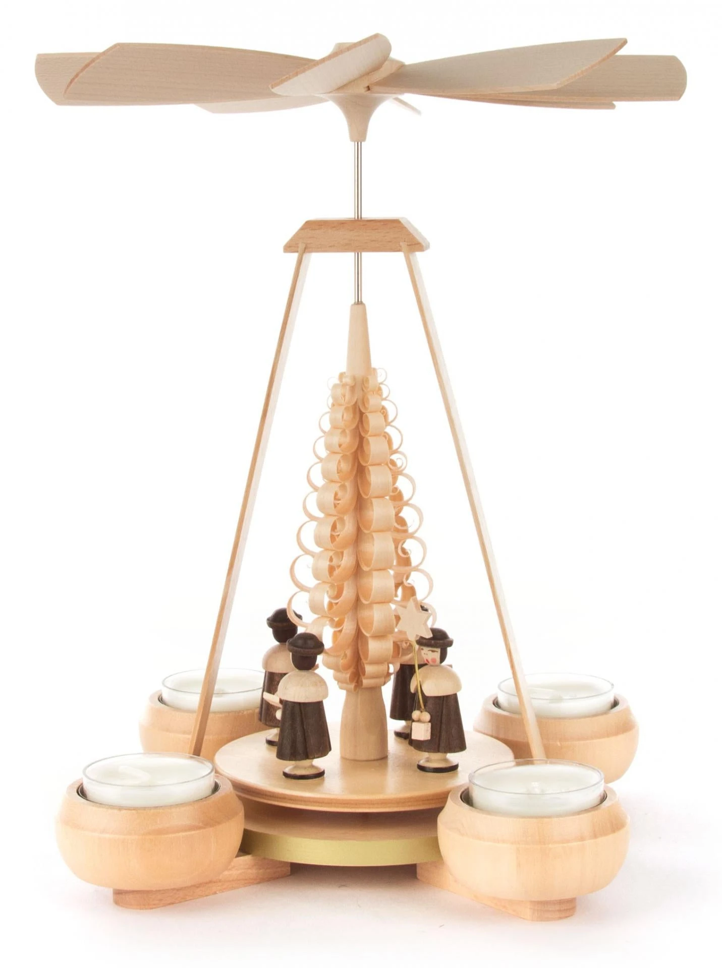 Authentic Wooden German Pyramid. This pyramid features one platform with four candle holders. When the candles are lit, the scene on the pyramid will begin to move as the heat from the candles begins to rise. Requires 4 – tealight candles – Not Included.
