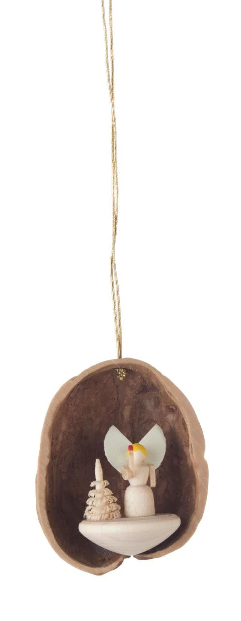 Authentic German Ornament. A real half walnut shell with an angel & tree inside.
