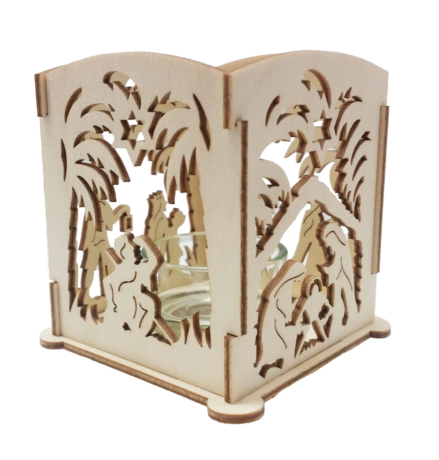Wooden hand crafted candle holder. Features the Nativity. Includes glass candle holder. Candle not included.