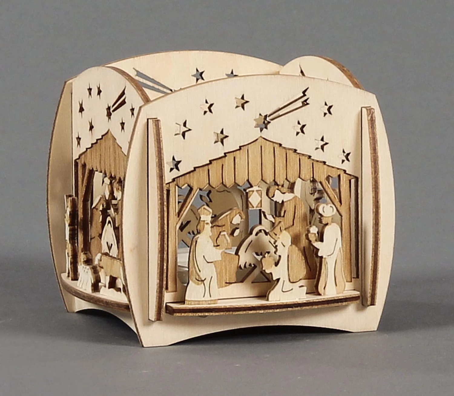 Wooden Candle Holder with Nativity Scene. Requires 1 Tealight Candle.