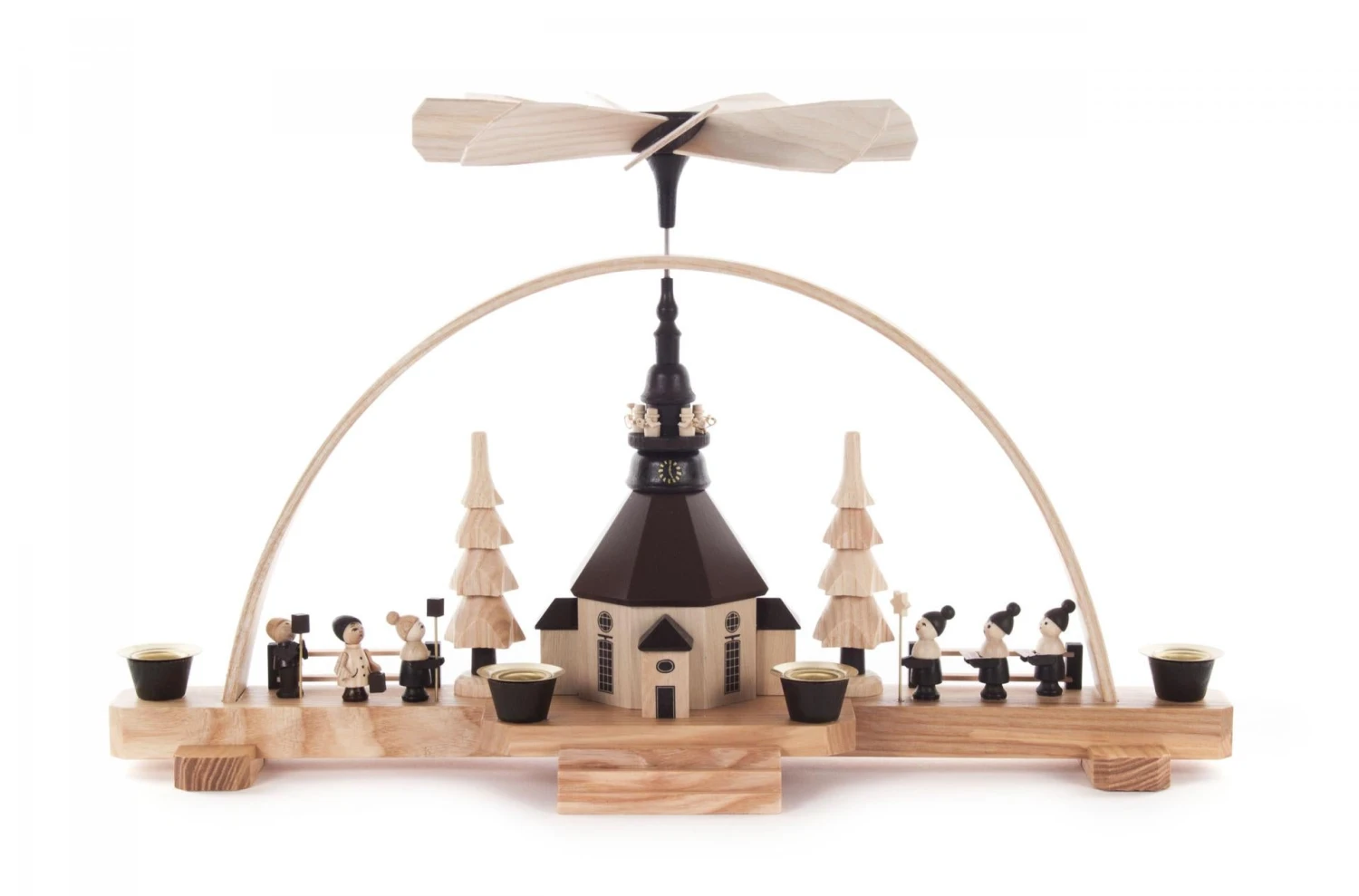 This authentic Pyramid/Schwibbogen features a Seiffen church scene