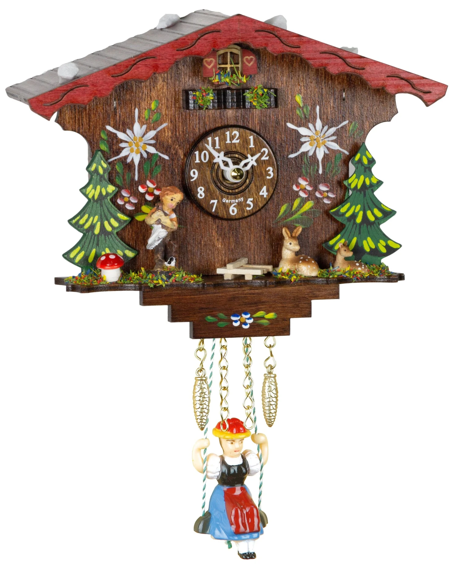 This clock cuckoos or plays music on the hour. Pendululm swings continuously.