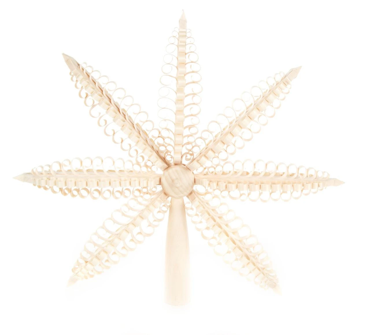 The points of the star are decorated with the curly shaved wood typical of an Erzgebirge Spanbaum.
