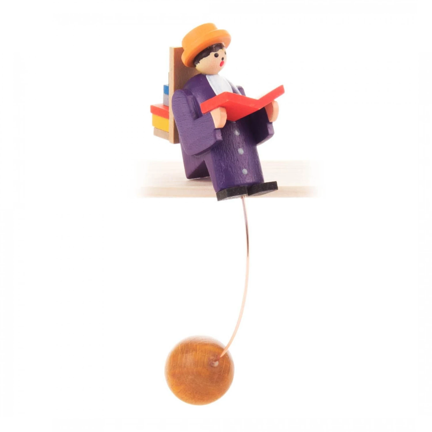 The rocking figure is placed on a shelf or on a table edge. Then you move the ball and the figure starts to swing.