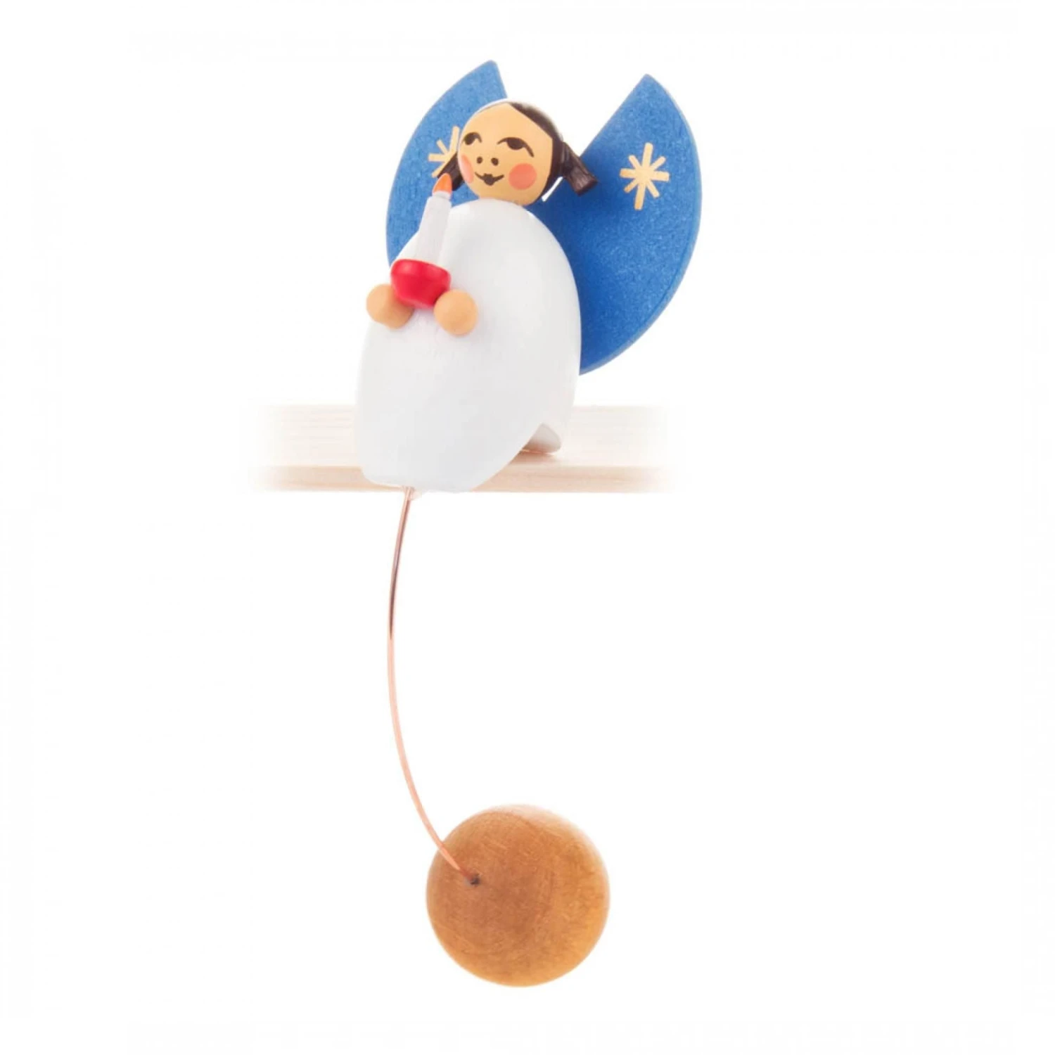 The rocking figure is placed on a shelf or on a table edge. Then you move the ball and the figure starts to swing.