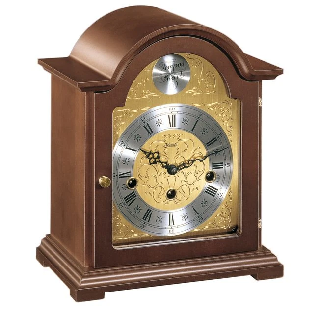 Mantel Clock Made in Germany. This traditional style bracket clock is made of selected hardwoods with warm walnut finish, and displays an elegant etched dial. Includes 8-day Quarterly Chime Westminster movement. Chime Silence Option.