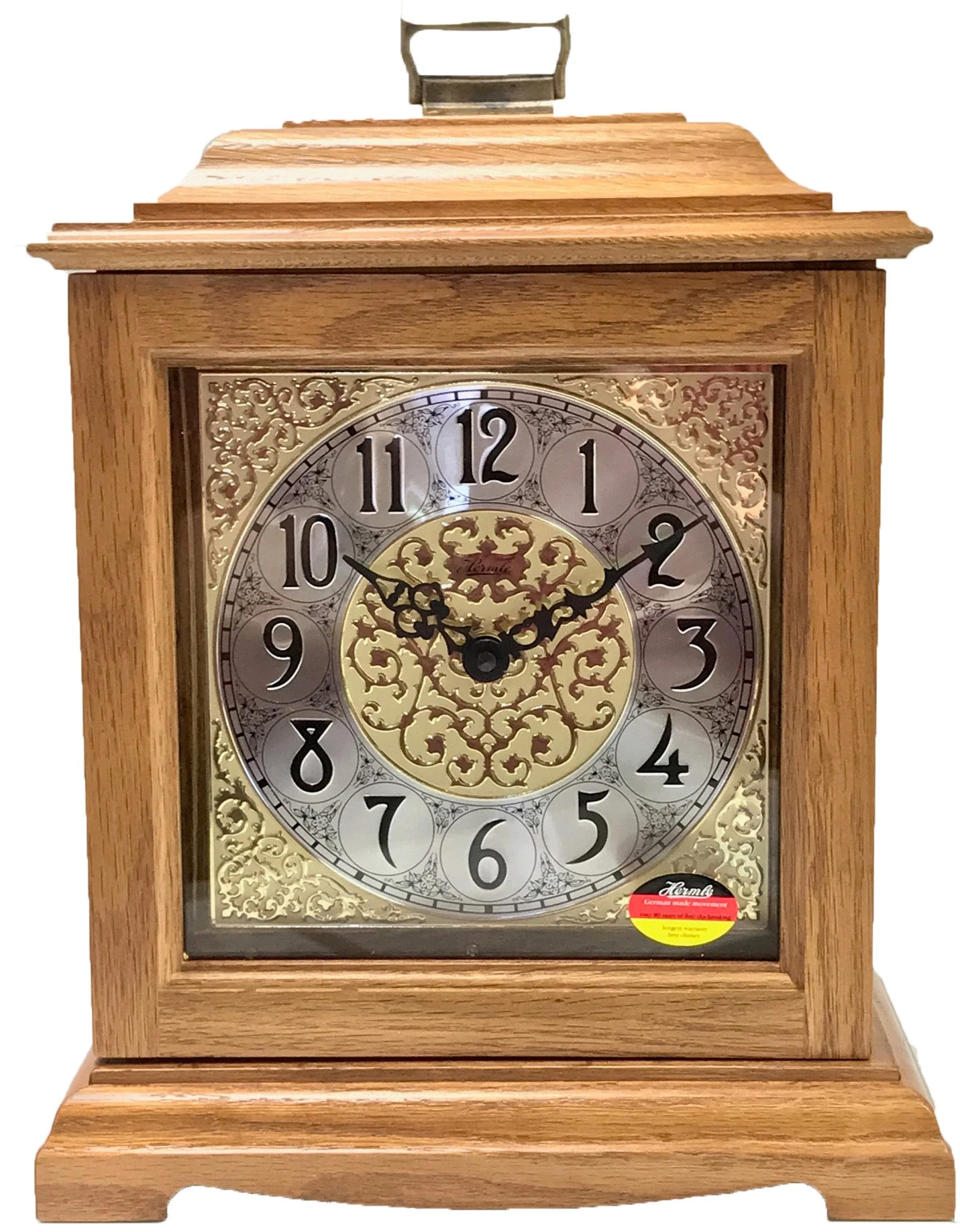 Traditional American styled bracket clock in an elegant light oak finish. Rich embossed metal dial with black Arabic numerals. Outfitted with a dual-chime quartz movement plays 1/2 hour Bim-Bam or 4/4 Westminster chime with night shut-off.