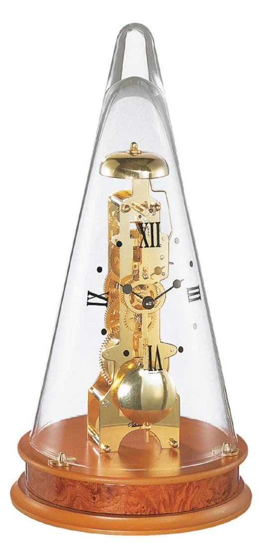 Base of the clock is made of light cherry wood with burlwood applications, a piano finish, 8-day skeleton movement with front pendulum, and a single bell strike on the top of each hour.