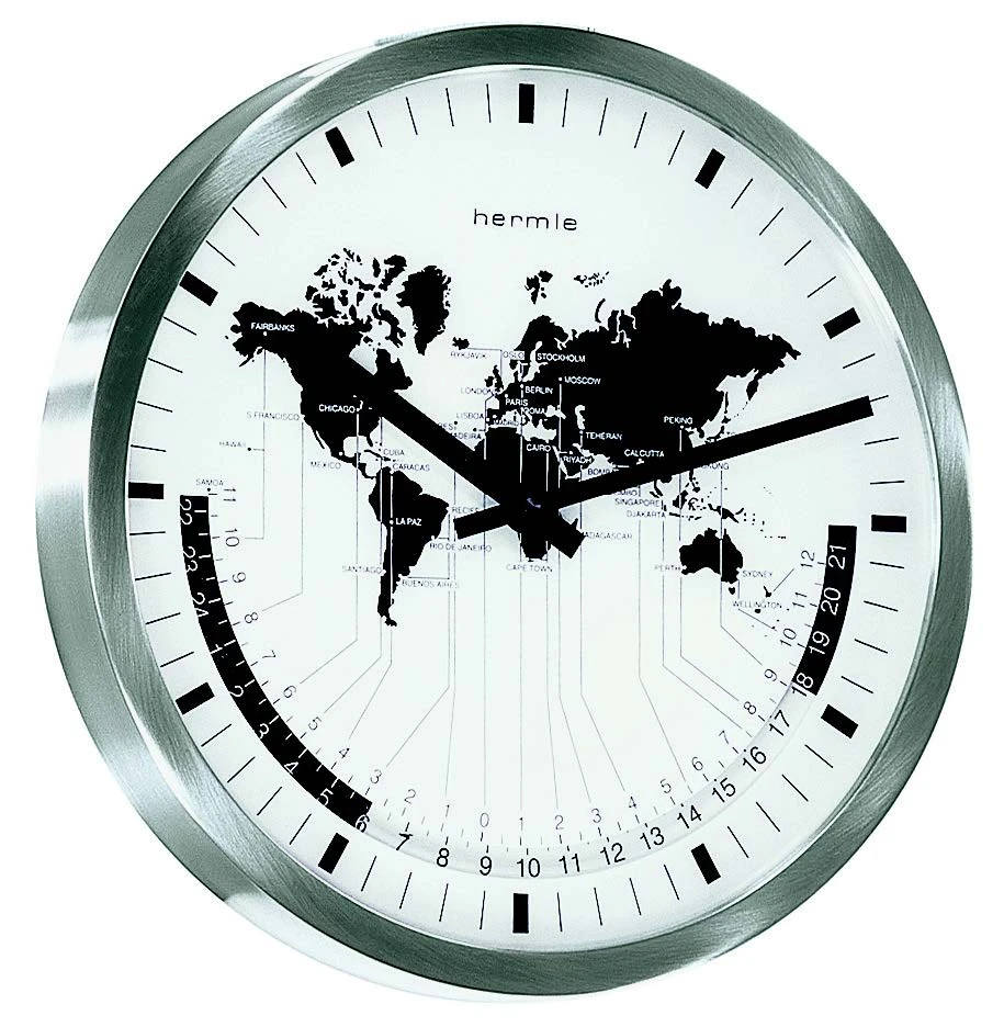 Brushed stainless steel case with convex mineral front glass, world time display.