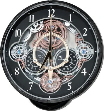 The Gadget reads the temperature, humidity, has motion, and it tells time. On the hour, the gears take move, meanwhile the dial takes a full revolution around while playing one of 30 melodies: 12 Popular, 12 Classical, and 6 Christmas. Designed beautifully with a continuous rotating gear at the bottom and 6 Swarovski Crystals.