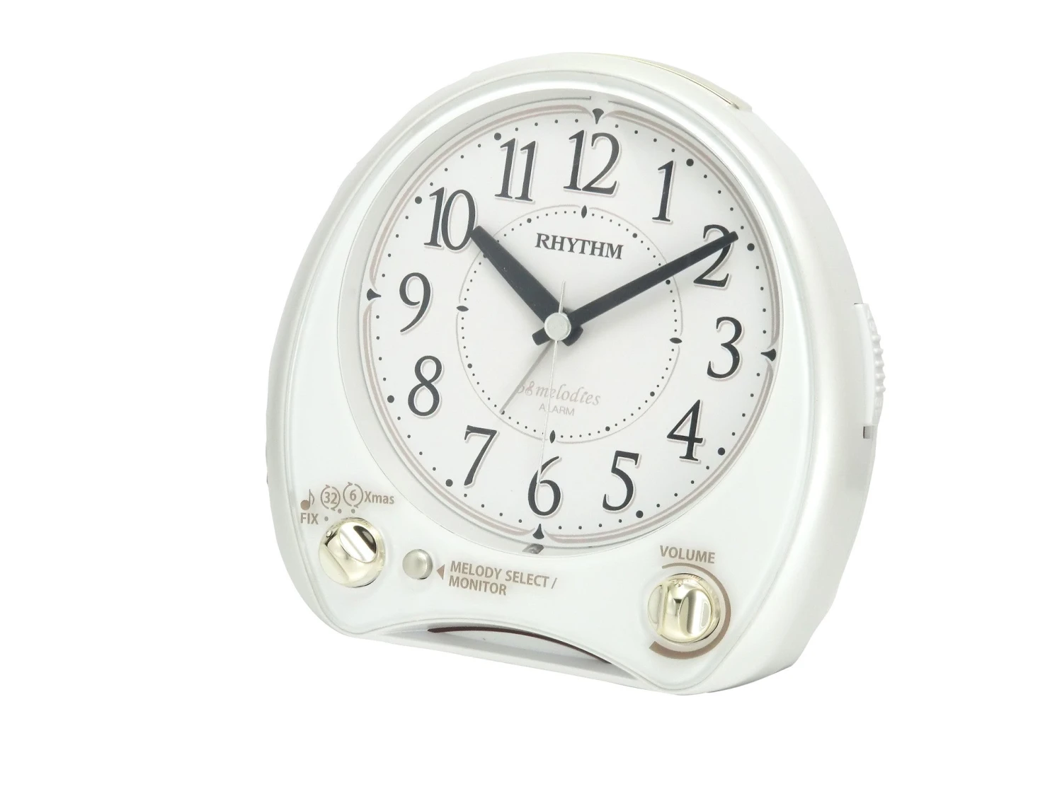 The alarm rings one of 38 melodies from 2 different melody selections at alarm time. It may also play the same melody of your choice at alarm time with the “FIX” setting.