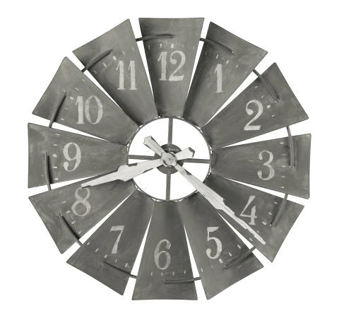 This large 34″ diameter windmill style metal wall clock features an antique brownish charcoal finish and significantly aged white hour and minute hands for an aged look. Aged white Arabic numerals and minute track decorate the fixed windmill blades. Quartz, battery-operated movement requires one AA sized battery.