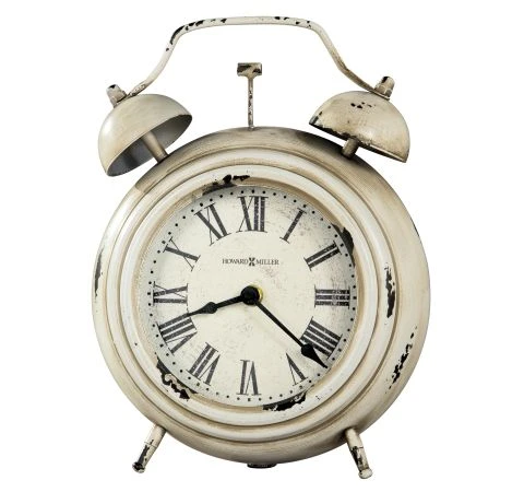 This 8.5″ round metal mantel clock features a distressed antique white finish for an aged appearance, and includes decorative faux bells and hammer plus a fixed top handle.Aged dial with aged, black Roman numerals, black spade hour and minute hands and a glass crystal.Quartz, battery-operated movement.