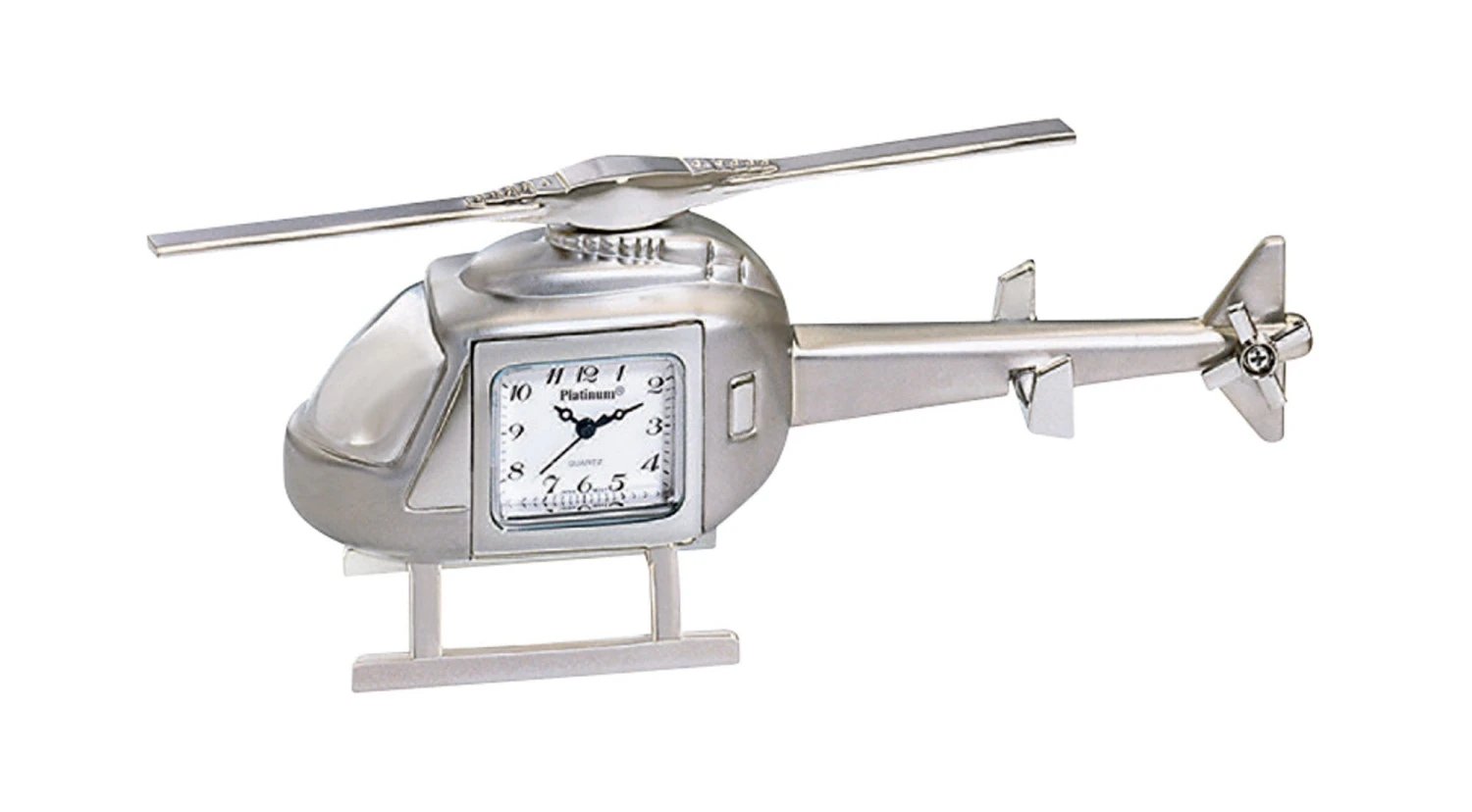 This silver helicopter is crafted from metal. Placed on the side is an accurate analog quartz movement.