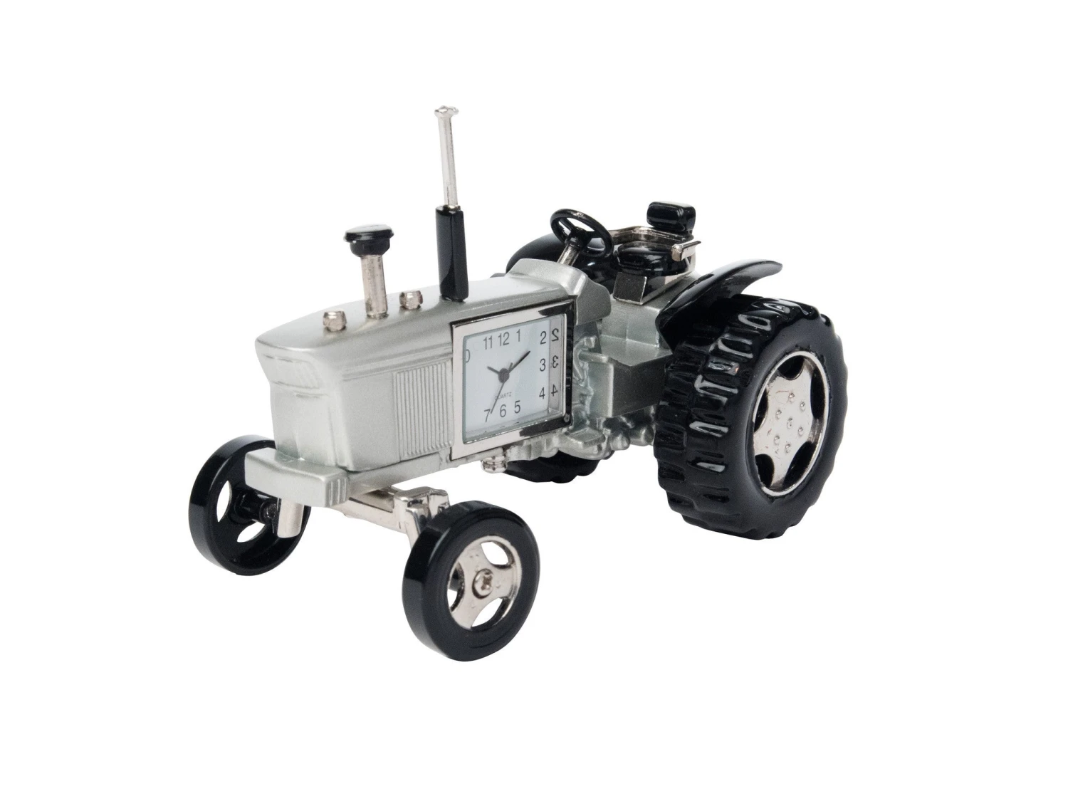 Miniature tractor clock with quartz clock. Made of zinc alloy. Makes a great gift for tractor lovers. Elegant weighted clock made with great detail.Â