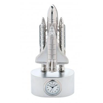 This silver space shuttle clock is crafted from metal. Placed on the platform is an accurate analog quartz movement.