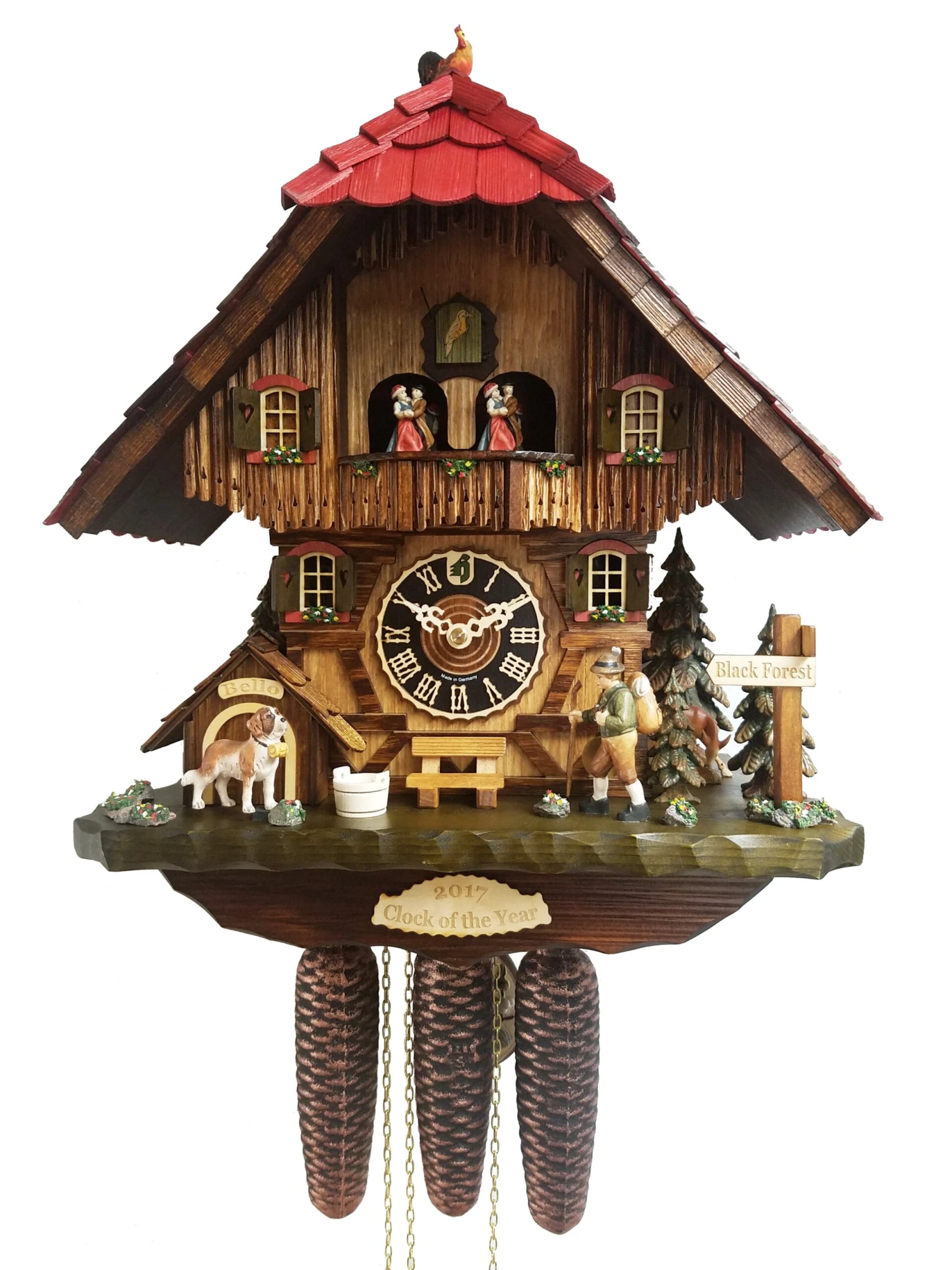 This beautiful Black Forest chalet cuckoo clock will cuckoo the hour each hour, and once at half past. After the full hour cuckoo call, it will play one of two melodies (“Edelweiss” & “The Happy Wanderer”) while the dancers rotate around the balcony, the dog will move up and down, and the wanderer will move his stick up and down. Six feet of chain will hang below the clock with three pine cone shaped cast weights. Wooden dial, hands, and cuckoo bird. Night Shut-Off Lever with Automatic Night-Off Feature.