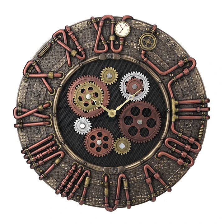 Steampunk is a genre with one of the fastest growing fan bases. Whether you have loved it for a long time or are newly discovering it, this clock is sure to catch your eye! The time piece has a face of gears and cogs, with elegant golden hands to tell you the hour. Conduits in rich copper and brass colors snake their way around the round border. Unique… and useful!